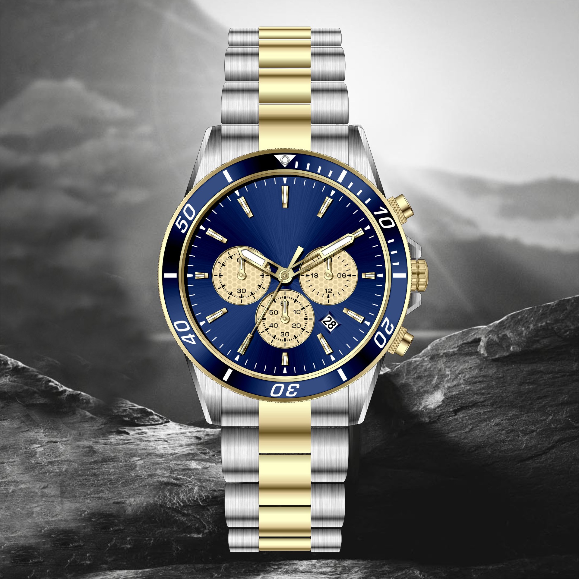 Multi-Function Dial: Features chronograph, calendar, small three-hand design, and 24-hour indicator.